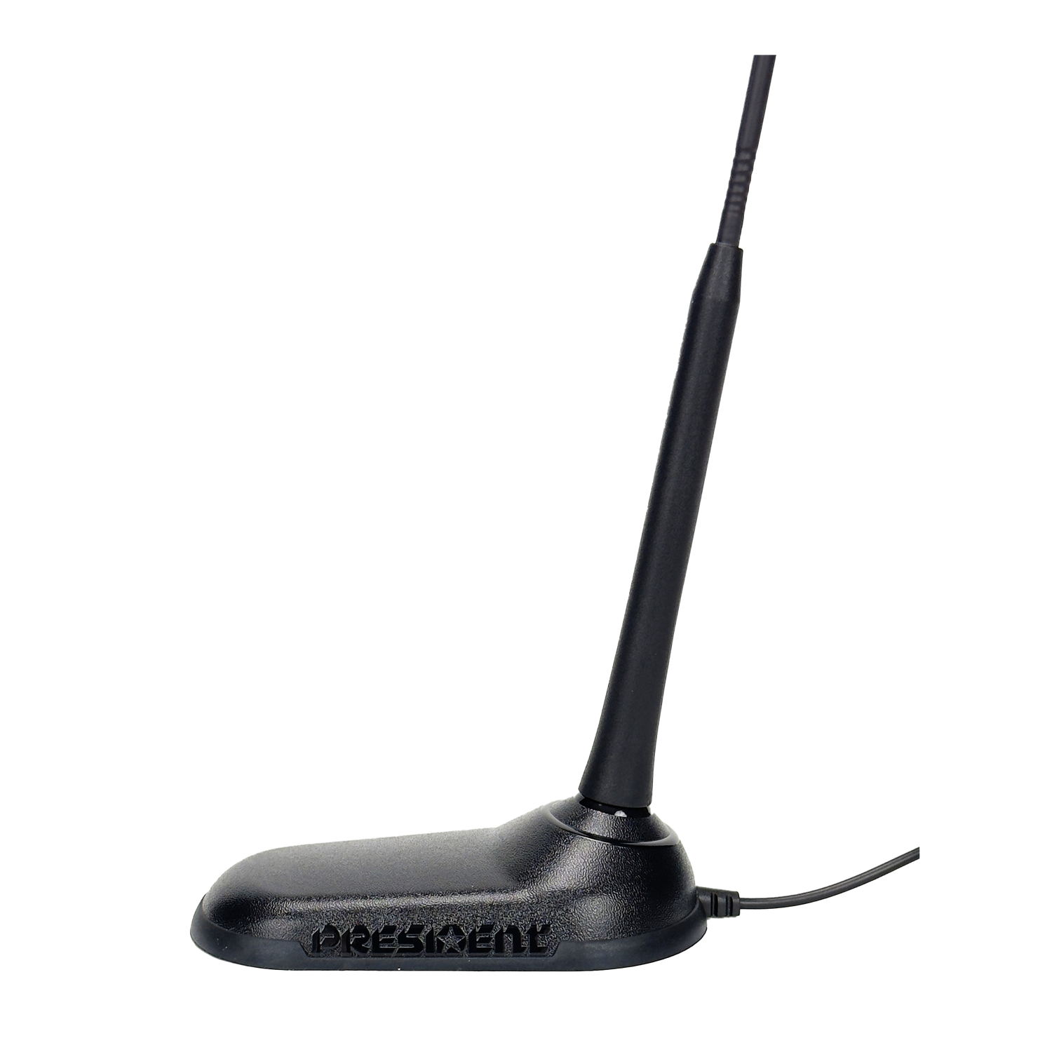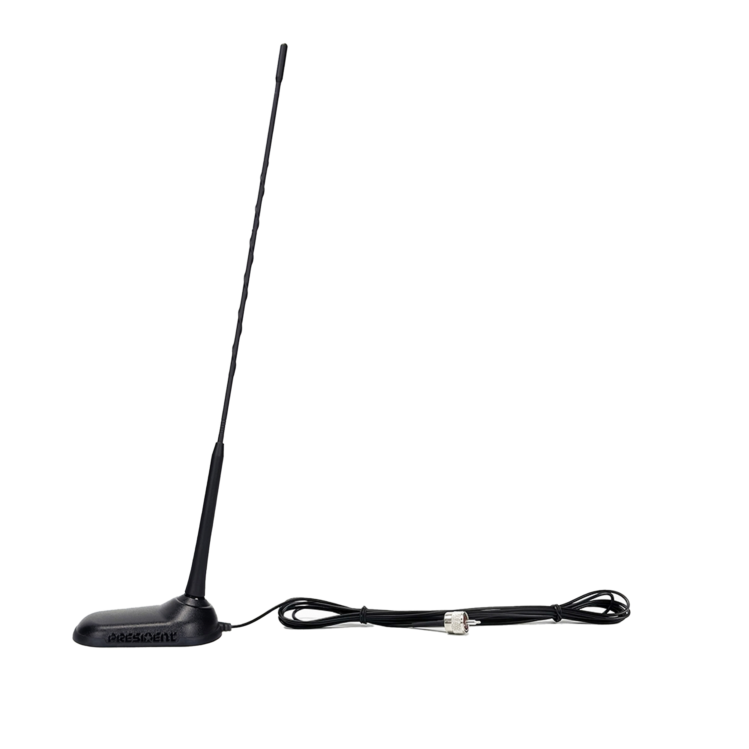 Antenna: The President Virginia is a modern magnetic CB antenna that's low-profile and ideal for a compact emergency antenna. The Virgina is 19.69" tall, pre-tuned, 1/4 wave antenna that has a 250 watt power limit. This antenna is designed for the 26-28 MHz frequency range and receives NOAA weather channels.